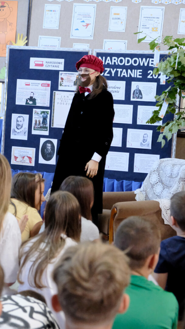 Do wspólnego czytania w naszej szkole włączyli się wszyscy uczniowie, zarówno Ci starsi jak i najmłodsi. Na zajęciach uczniowie poznali biografię Jana Kochanowskiego i wspólnie czytali fraszki, pieśni oraz treny, które mimo upływu wieków wciąż uczą i skłaniają do refleksji. Najmłodsi uczniowie wykonali prace plastyczne, a starsi mogli wziąć udział w konkursie wiedzy o poecie i jego dziełach.