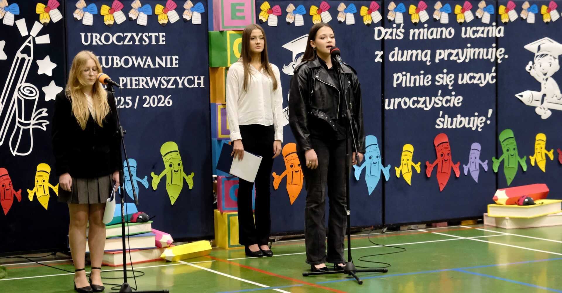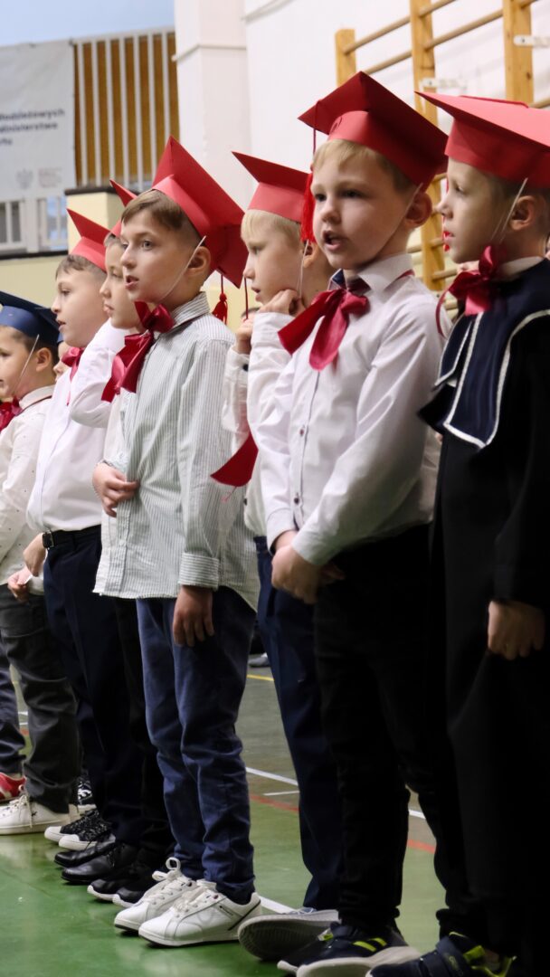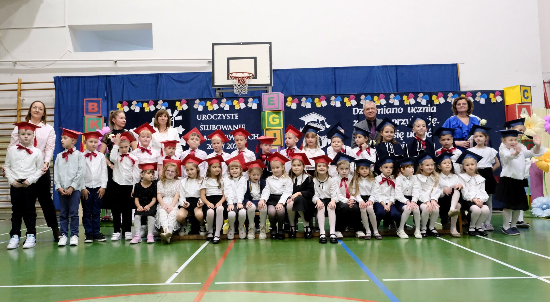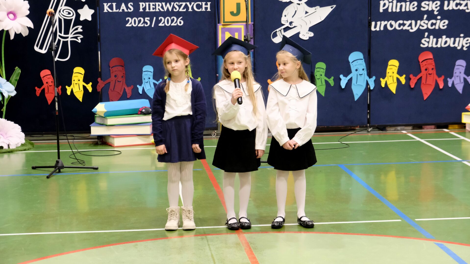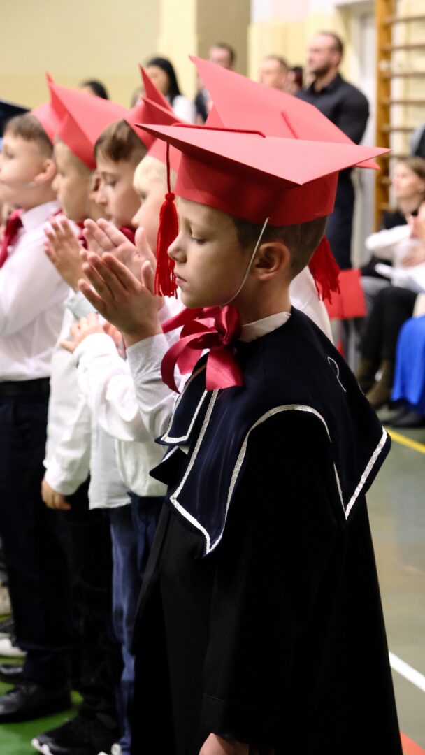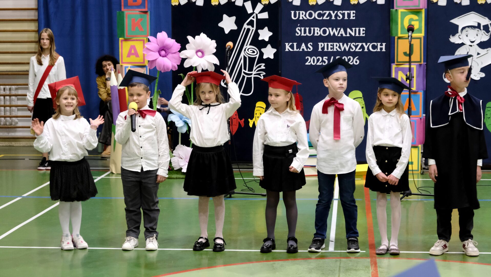 Słowami przysięgi, 29 października 2025r. wszyscy uczniowie klas pierwszych naszej szkoły złożyli uroczyste ślubowanie. Pomimo tremy jaka występuje przy podniosłych uroczystościach, wszystko wypadło znakomicie. Dzieci świetnie prezentowały się w strojach galowych oraz kolorowych, uczniowskich biretach. Nie sposób było oderwać od nich oczu.