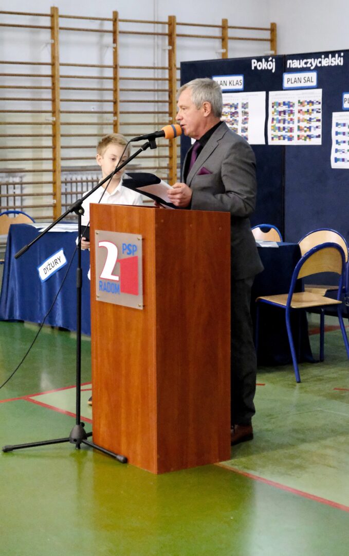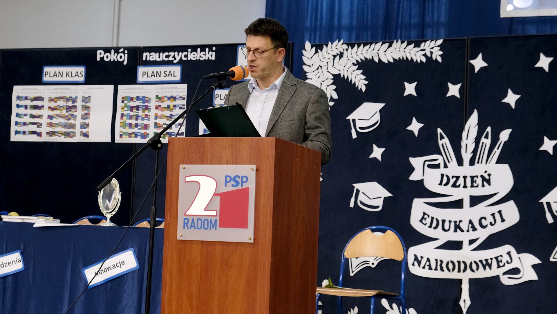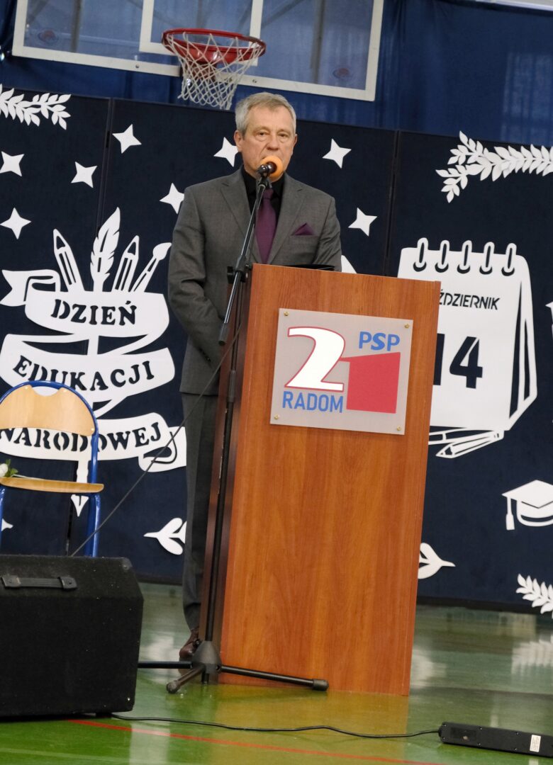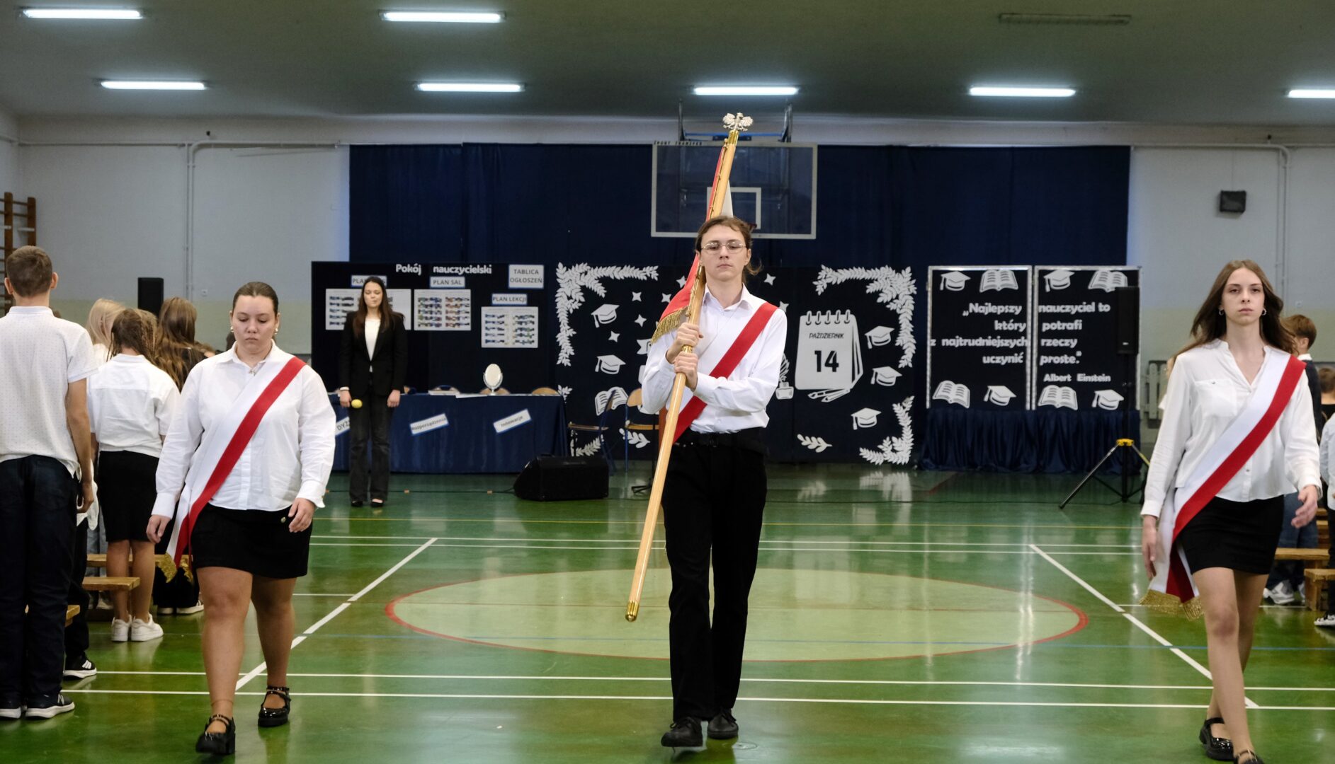 Uroczystość rozpoczęła się wniesieniem sztandaru szkoły oraz wspólnym odśpiewaniem hymnu państwowego. Po części oficjalnej głos zabrał dyrektor szkoły pan Robert Bartkiewicz, który w ciepłych słowach podziękowała nauczycielom i pracownikom szkoły za ich codzienną pracę, zaangażowanie oraz troskę o rozwój uczniów. Przybliżył również historię powstania powszechnej systemu edukacji. Następnie wystąpił przewodniczący Rady Rodziców pan Jacek Schreiber, który również przekazał życzenia i słowa uznania dla całej kadry pedagogicznej.